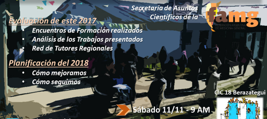 Los Equipos Tutoriales de la Secretaria de Asuntos Científicos de la FAMG convocan a una reunión evaluación del trabajo realizado este año y de planificación del 2018. Se realizará el sábado 11 de noviembre a las 9:00 hs. AM, en el Centro Integrador Comunitario CIC 18, situado en 161 y 20 de Berazategui, Provincia de Buenos Aires. Los temas a tratar: Evaluación de los Encuentros de Formación realizados en el año. Red de Tutores regionales para el acompañamiento de los trabajos científicos. Análisis final de los trabajos presentados en el Congreso Nacional 2017. Planificación de los Lineamientos del Años 2018, con la consigna de Más y mejores trabajos, Más Encuentros de Formación, Bibliografía FAMG, entre otros tantos temas. Todos los integrantes de Equipos de Salud invitados a la Reunión para participar desde el Rol que cada uno elija: sea Articulador-Facilitador, Tutor de trabajos y/o Encuentros de Formación. Grupo Facebook oficial: EQUIPOS TUTORIALES Secretaria Asuntos científicos FAMG 2017