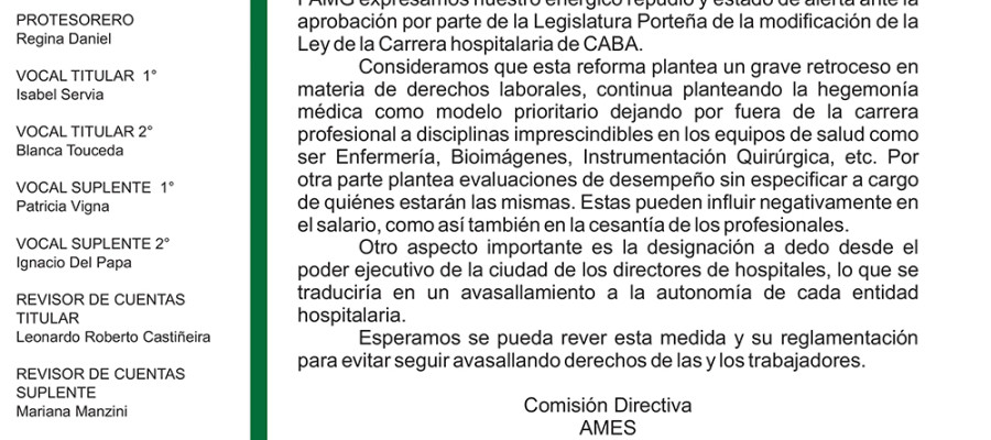 FAMG adhiere al repudio y estado de alerta planteado por la Asociación Metropolitana de Equipos de Salud (AMES), ante la aprobación de la modificación de la Carrera Hospitalaria de CABA.
