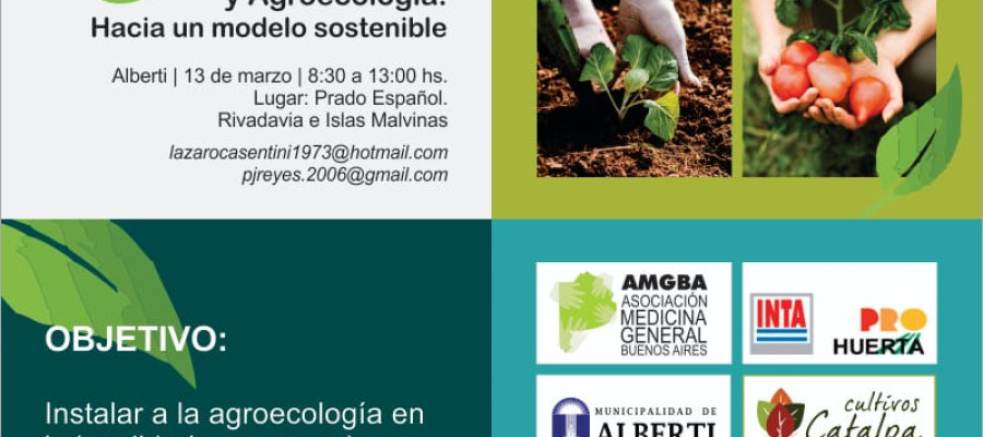 El evento tiene por objetivo tomar conocimiento de la huerta familiar para autoconsumo y la posibilidad de comercializar excedentes.. La regional oeste de AMGBA organiza e invita a la 1era Jornada de salud y agroecología. La charla contará con especialistas en salud, nutrición, biología y producción vegetal. Lugar: Prado Español (Rivadavia e Islas Malvinas) - Alberti. Fecha: 13 de marzo de 8.30 a 13hs. Para más información: lazarocasentini1973@hotmail.com Pjreyes.2006@gmail.com #Salud #Agroecologia #HuertaFamiliar #Autoconsumo #Nutrición #ProducciónVegetal